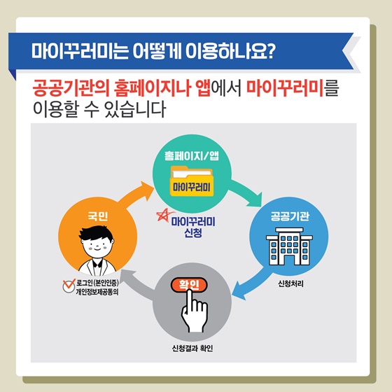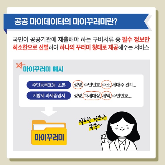 공공 마이데이터의 마이꾸러미는 공공기관에 제출해야 하는 구비서류 중 필수 정보만 최소한으로 선별하여 하나의 꾸러미 형태로 제공하는 서비스입니다.