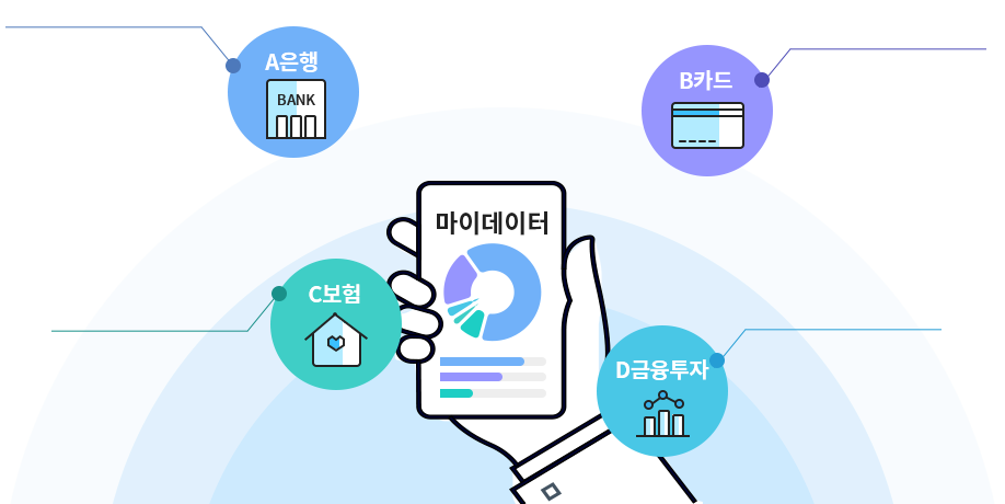 마이데이터 종합포털에서는 은행, 카드, 보험, 증권, 통신 등에 흩어져있는 개인의 금융정보를 수집하여 고객이 알기 쉽게 통합하여 제공합니다.