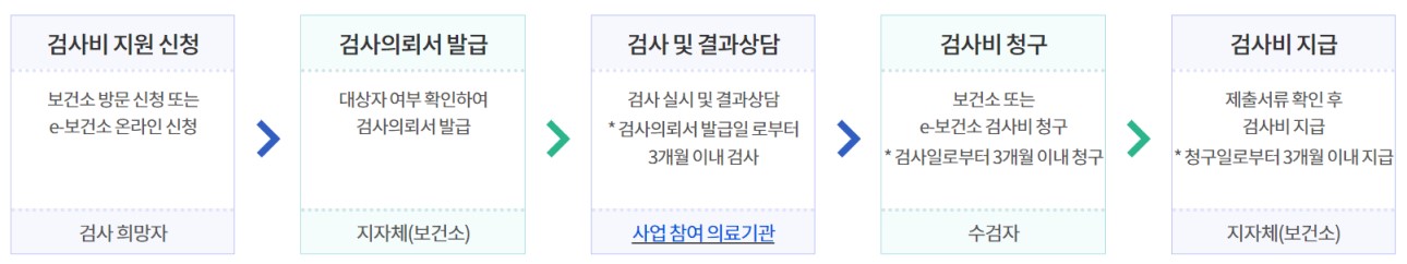 사업참여 의료기관에서 검사를 받으신 후 청구서와 진료비 세부내역서를 발급받으셔서 보건소 혹은 e보건소에 검사비를 청구하세요. 검사일로부터 3개월 이내 청구하시면 됩니다. 제출서류를 바탕으로 보건소에서 확인 절차를 거쳐 3개월 이내에 검사비를 지급합니다.