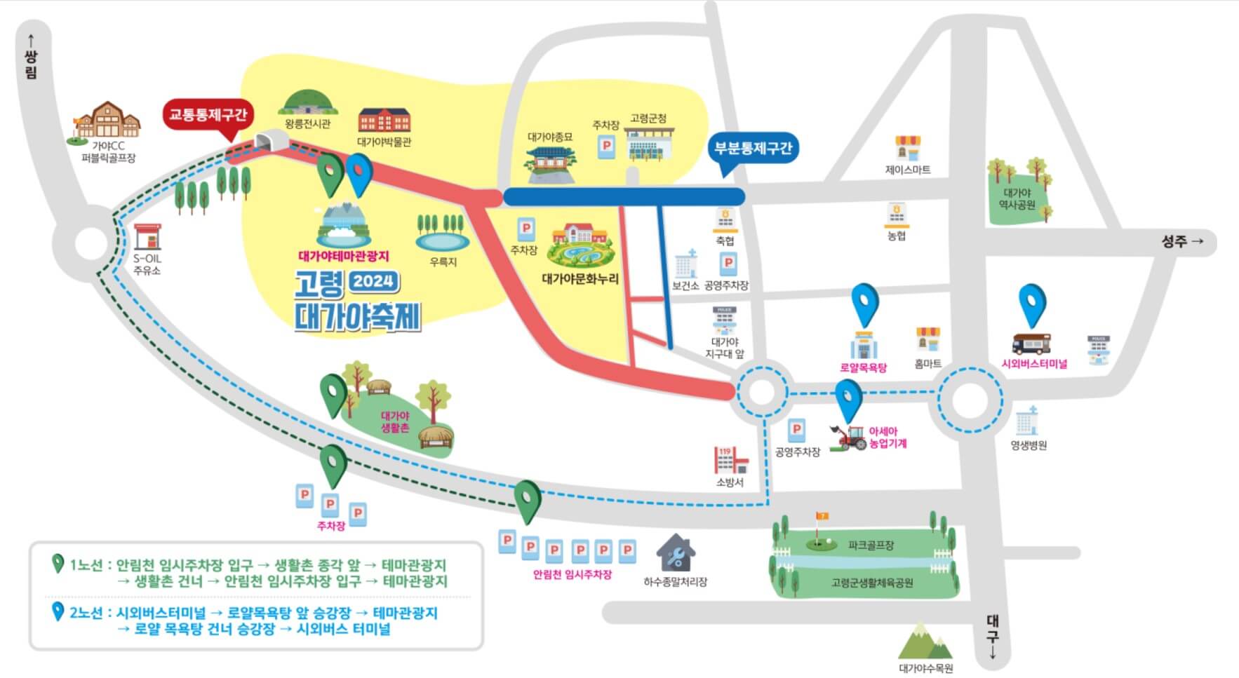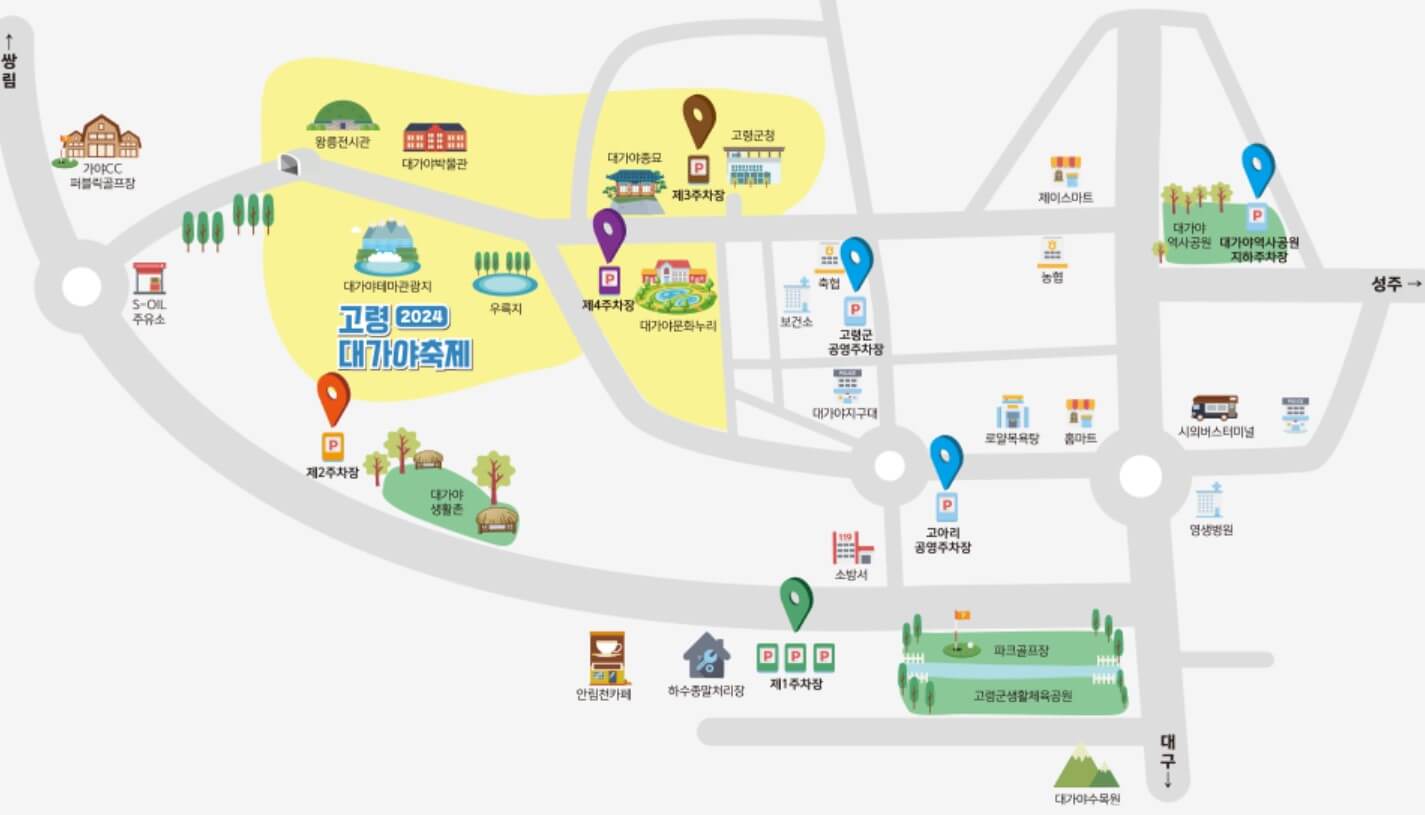 ● 축제장 주변 : 공영주차장 고아리 공영주차장, 대가야역사공원지하주차장, 고령군 공영주차장