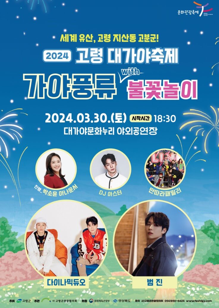 축제의 가장 하이라이트는 초대가수가 아닐까 합니다. 신나는 음악과 조명, 댄스 공연으로 축제의 분위기를 한껏 고취시킵니다. 2024 고령 대가야 축제에는 군민가왕 선발대회와 가야풍류 불꽃놀이에서 초대가수들을 보실 수 있습니다.