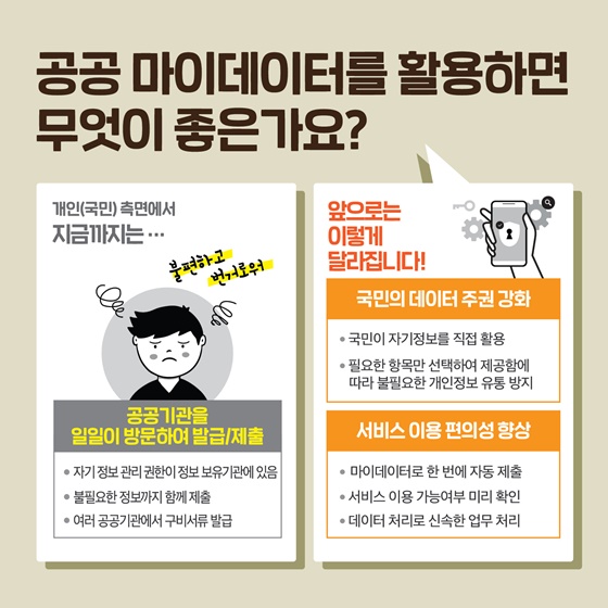 마이데이터란 기업이나 행정기관이 보유한 개인의 정보(생년월일, 주소, 가족관계, 납세, 금융정보 등)를 말합니다. 그중 핵심은 본인 정보에 대한 열람, 통제, 전송요구인데요, 이 전송요구권을 활용하여 행정기관이 보유하고 있는 개인 정보를 필요한 기관에 전송하도록 요구하는 공공 서비스입니다.