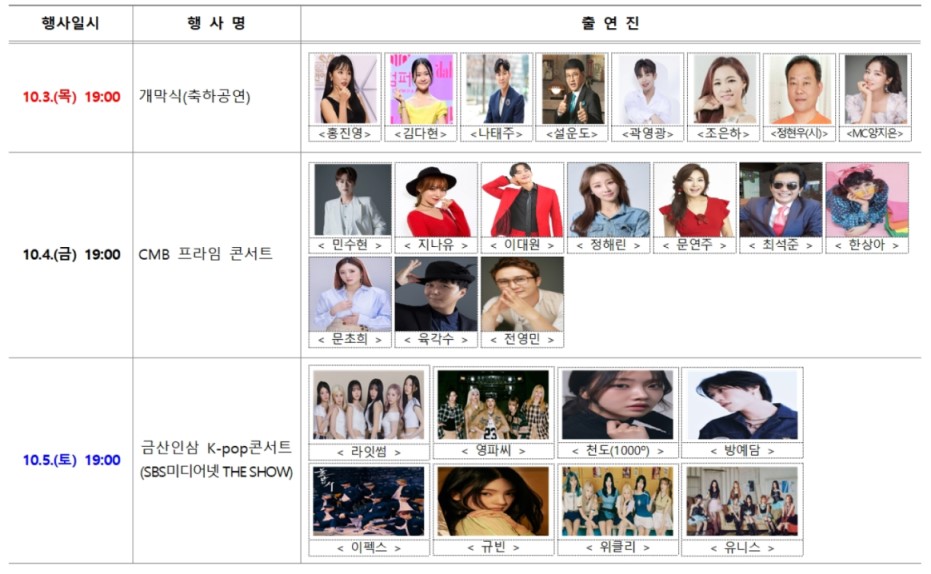 - 10월 3일(금) 개막식 : 홍진영, 김다현, 나태주, 설운도, 곽영광 외