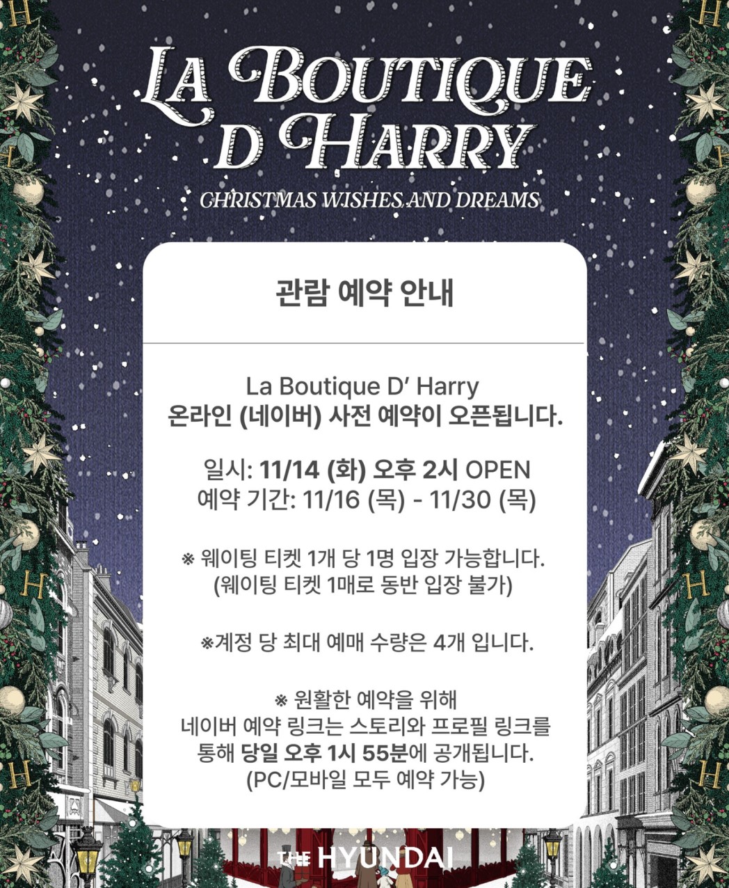 LA BOUTIQUE D’ HARRY의 입장을 위한 예약은 네이버 예약을 통해 가능합니다. 네이버 예약은 11월 14일(화) 오후 2시에 열릴 예정입니다. 이날 예약을 통해 11월 16일(목) - 11월 30일(목)의 입장일을 선택하실 수 있습니다.