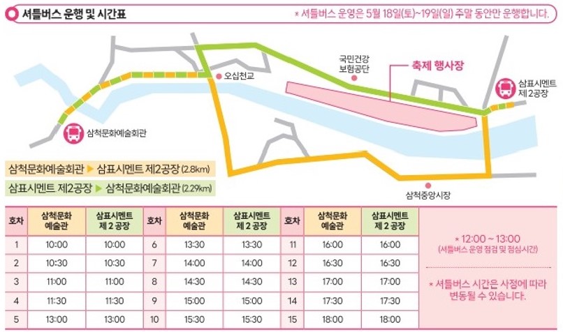 셔틀버스는 5월 18일(토) ~ 19일(일) 주말 동안 삼척문화예술회관과 삼표시멘트 제2공장에서 오전 10시부터 오후 6시까지 운영됩니다. 매시 정각과 30분에 운행하며 12시 ~ 13시까지는 운행하지 않습니다. 주말 교통상황에 따라 운행시간이 변경될 수 있습니다. 아래의 운행노선과 시간표를 참고하세요.