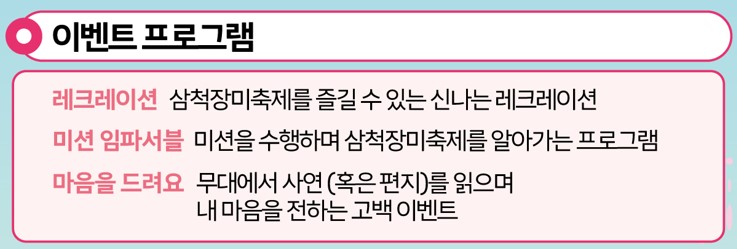 이벤트 프로그램으로 축제기간 동안 진행되는 레크리에이션, 미션임파서블 등이 진행됩니다. 편지나 사연을 메인 무대 운영본부에 접수하시면 마음을 전해드리는 고백 이벤트도 진행되니 이 기회를 놓치지 마세요.