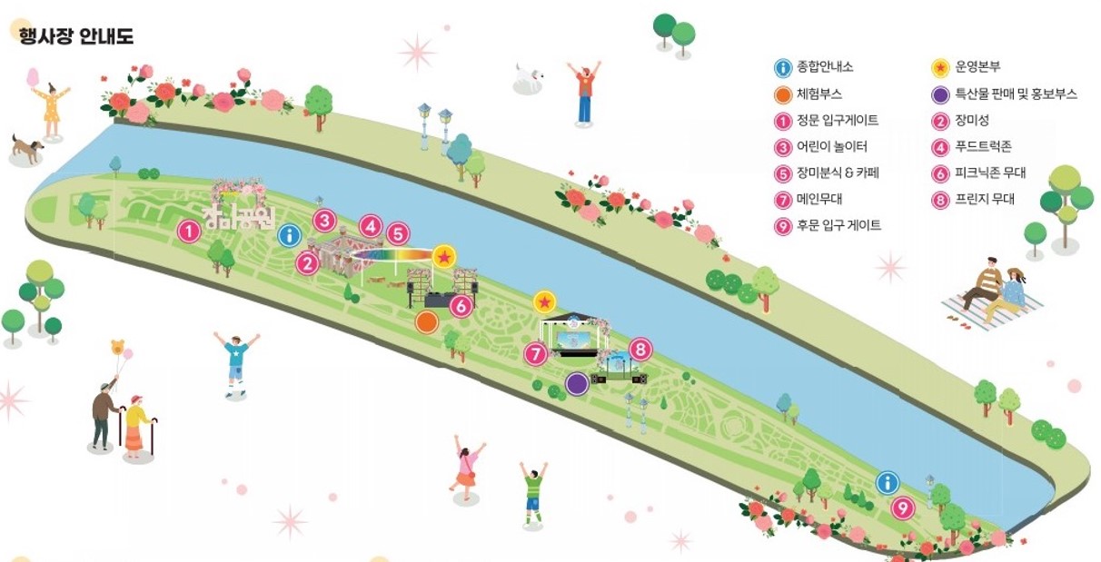 삼척 장미축제가 열리는 곳은 삼척 오십천 부근의 장미공원입니다. 축제기간에는 안내소를 비롯해서 체험부스, 메인 무대, 푸드트럭, 어린이 놀이터 등이 설치되니 미리 위치를 확인하시고 방문하시기를 추천합니다.