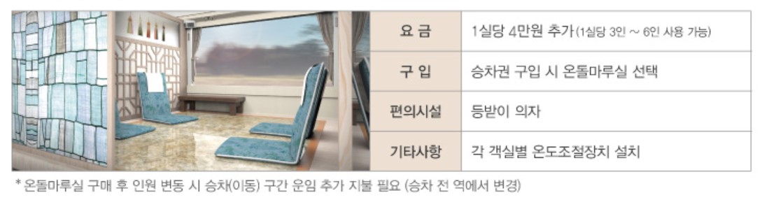 온돌마루 객실을 이용하실 경우 기차 이용요금 외에 1실당 4만원의 추가 요금이 있습니다.