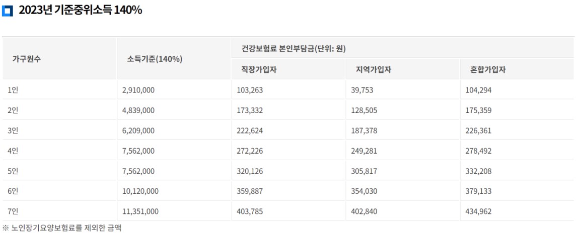 중위소득 140%는 건강보험료 납부금액으로 확인해 볼 수 있습니다. 아래의 표를 참고하세요.