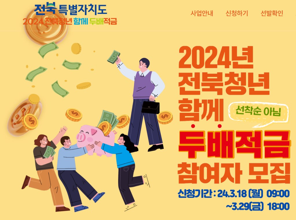 전라북도에서 2024년 전북청년 함께 두배적금 참여자를 모집합니다. 월 10만원을 내면 2년 만기 시 500만원을 수령할 수 있는 적금으로 전북에 거주하는 39세 이하의 청년을 대상으로 합니다. 3월 29일(금)까지 신청하실 수 있으니 지원자격과 신청방법 등을 자세히 알아보겠습니다.