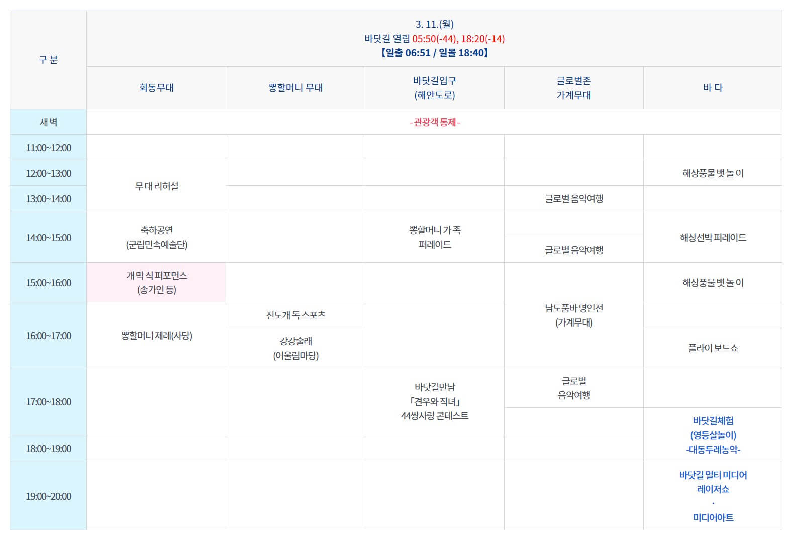 축제 기간 3일 동안 이른 아침과 저녁 무려 하루 두 번씩 바닷길이 열립니다. 안전을 위해 이른 새벽이나 늦은 밤에는 통제에 따라주시는 것이 좋습니다.