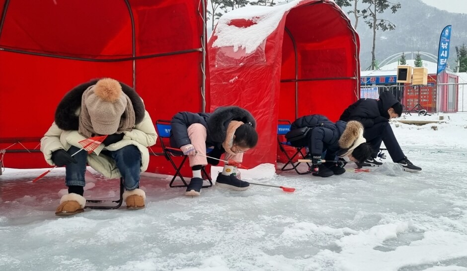 겨울 낚시의 묘미 얼음낚시를 해 볼 수 있는 기회입니다. 얼음 구멍에서 물고기를 기다리는 재미를 느껴보세요. 1인당 얼음구멍 1개가 포함되며 현장에서 입장권 구입하여 이용하시면 됩니다.