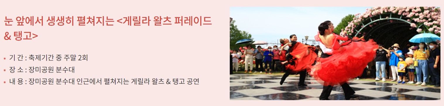 곡성세계장미축제에는 공연이 다양한데요, 뮤지컬, 퓨전국악공연, 왈츠와 탱고퍼레이드를 축제 기간 중에 즐기실 수 있습니다. 또한 경품이벤트로 장미 속에서 특별한 장미를 찾으면 순금 반돈을 드리는 <행운의 황금장미를 찾아라> 이벤트도 진행됩니다.