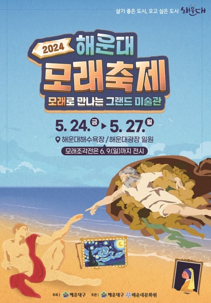 매년 여름 해운대에서는 모래 조각 전시를 볼 수 있는 모래축제가 열립니다. 올해는 5월 24일(금)부터 27일(월)까지 열리는데요, '해운대해수욕장 그랜드 미술관'을 주제로 고흐, 뭉크, 미켈란젤로 등의 작품을 모래로 만나보실 수 있습니다. 다른 곳에서는 접하기 힘든 독특한 축제인데요 놓치지 말고 꼭 구경 가보세요.