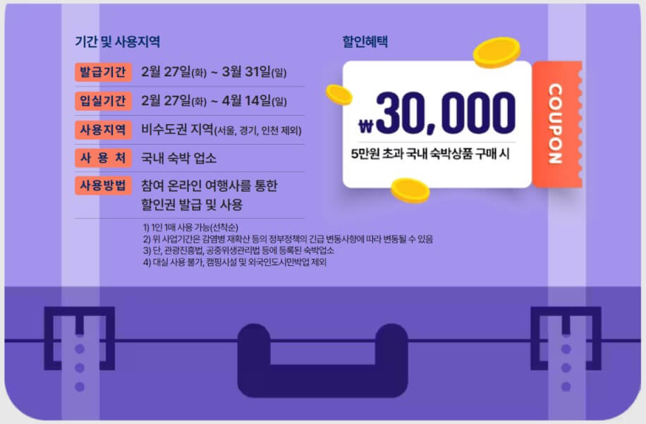 지방 여행의 경기 활성화를 위한 정책으로 수도권(서울, 경기, 인천) 지역은 제외됩니다. 비수도권 지역 숩가시 숙박비 3만원이 할인됩니다. 온라인으로 5만원 초과 숙박 상품 예약 시 3만원 쿠폰이 제공됩니다.